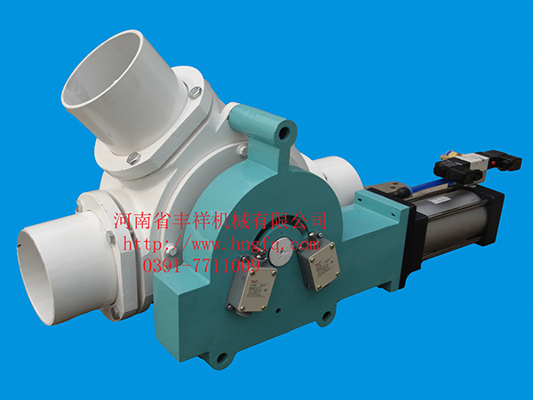 在閥芯中間設有一個徑向通道將進料管和一根直通出料管聯(lián)通,另一根斜通出料管則處于關閉狀態(tài)。此時,電磁閥斷電,氣缸中的活塞處在上始點;當電磁閥通電,活塞反向動作拉至下始點,齒條便帶動齒輪和閥芯旋轉(zhuǎn),則通道位罝被改變,使進料管與另一根斜通出料管聯(lián)通而將原來的直通出料管關閉。如此,只需讓電磁閥通電和斷電就可改變氣缸活塞動作達到切換物料方向之目的。
